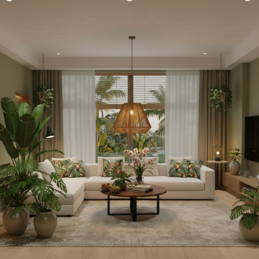 Une inspiration tropicale pour un intérieur épuré et chaleureux.